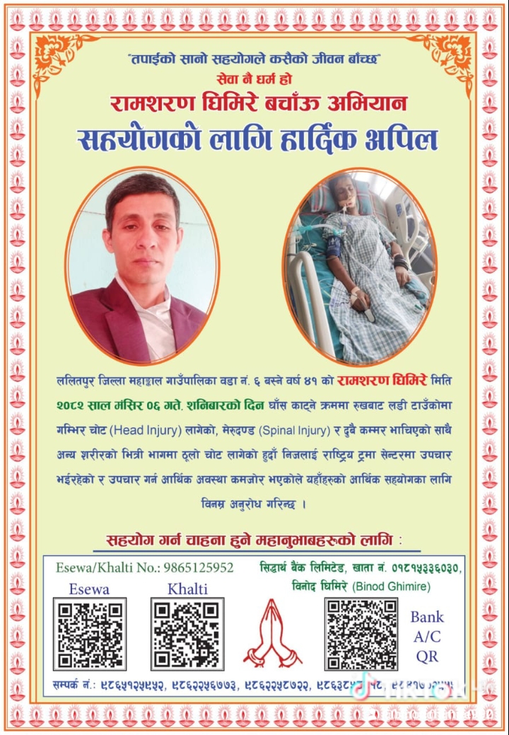 काठमाडौं । ललितपुर जिल्ला महाँङ्काल गाउँपालिका वडा नम्बर ६ गुमराङ्गका स्थायी बासिन्दा रामशरण घिमिरेलाई बचाउन अभियान सुरु गरिएको छ । २०८२ मंसिर ६ गते शनिबार घरनजिकै घाँस काट्ने क्रममा रुखबाट लडि सख्त घाइते भएका घिमिरेको टाउकोमा गम्भीर चोट (हेड इन्जुरी), मेरुदण्ड र दुवै कम्बर भाचिएको साथै शरीरका भित्री भागमा ठुलो दख्खल परेको छ ।