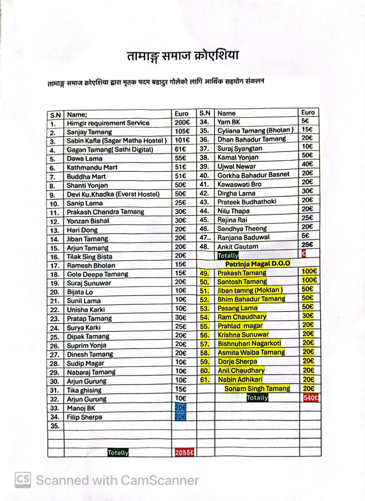 मृतक पदम बहादुर गोलेको नाममा हिमगिर रिक्वायरमेन्ट सर्भिसले २ सय युरो, सञ्जय तामाङले १०५ युरो, सगरमाथा होस्टल सञ्चालक सबिन काफ्लेले १०१ युरो, गगन तामाङ ६१ युरो, दावा लामा ५५ युरो, काठमाडौं मार्ट ५१ युरो, बुद्ध मार्ट ५१ युरो, शान्ति योञ्जन ५० युरो, देवी कुमारी खड्का ५० युरो लगायत ६३ व्यक्ति तथा संघ संस्थाले गरि जम्मा २०७५ सहयोग रकम उपलब्ध गराएका थिए ।